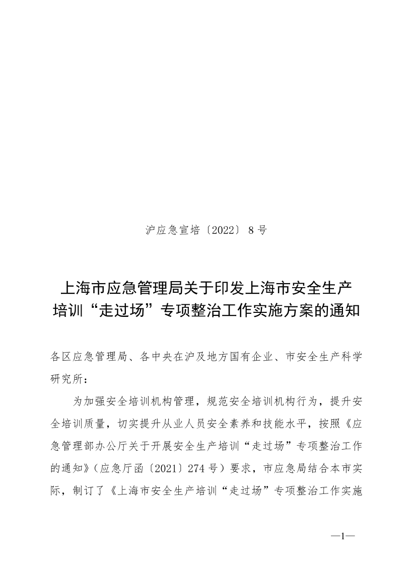 为加强安全培训机构管理,规范安全培训机构行为,提升安全培训质量,切实提升从业人员安全素养和技能水平,按照《应急管理部办公厅关于开展安全生产培训“走过场”专项整治工作的通知》(应急厅函〔2021〕274号)要求,市应急局结合本市实际,制订了《上海市安全生产培训“走过场”专项整治工作实施方案》,现印发你们,请认真抓好落实。
