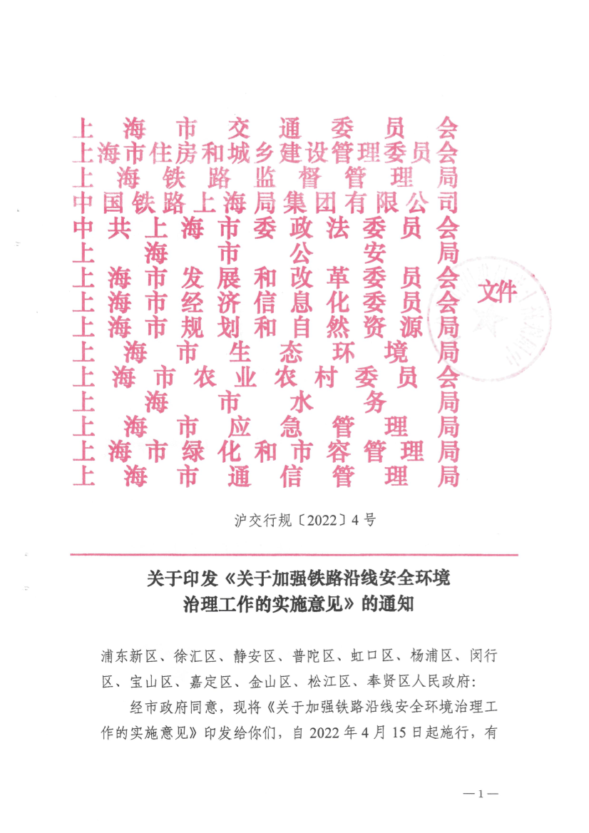 经市政府同意,现将《关于加强铁路沿线安全环境治理工作的实施意见》印发给你们,自2022年4月15日起施行,有效期至2025年12月31日止。请认真按照执行。