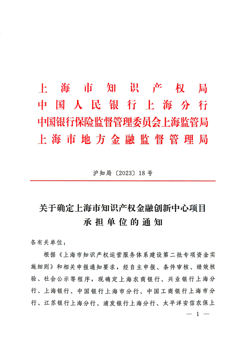 根据《上海市知识产权运营服务体系建设第二批专项资金实施细则》和相关申报通知要求,经自主申报、条件审核、绩效核验、社会公示等程序,现确定上海农商银行、兴业银行上海分行、上海银行、中国银行上海市分行、中国工商银行上海市分行、江苏银行上海分行、浦发银行上海分行、太平洋安信农保上海分公司、人保财险上海市分公司、上海浦东科技融资担保有限公司等10家单位为上海市知识产权金融创新中心项目承担单位。