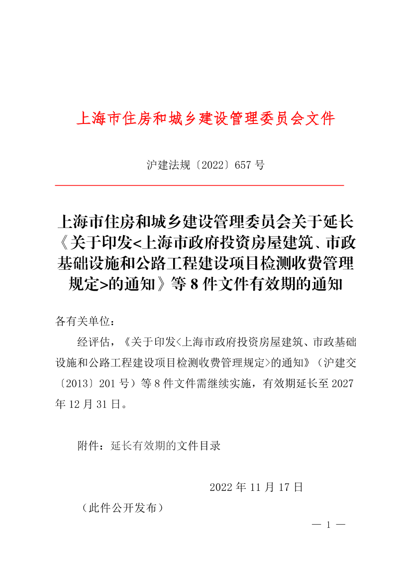 经评估,《关于印发<上海市政府投资房屋建筑、市政基础设施和公路工程建设项目检测收费管理规定>的通知》(沪建交〔2013〕201号)等8件文件需继续实施,有效期延长至2027年12月31日。