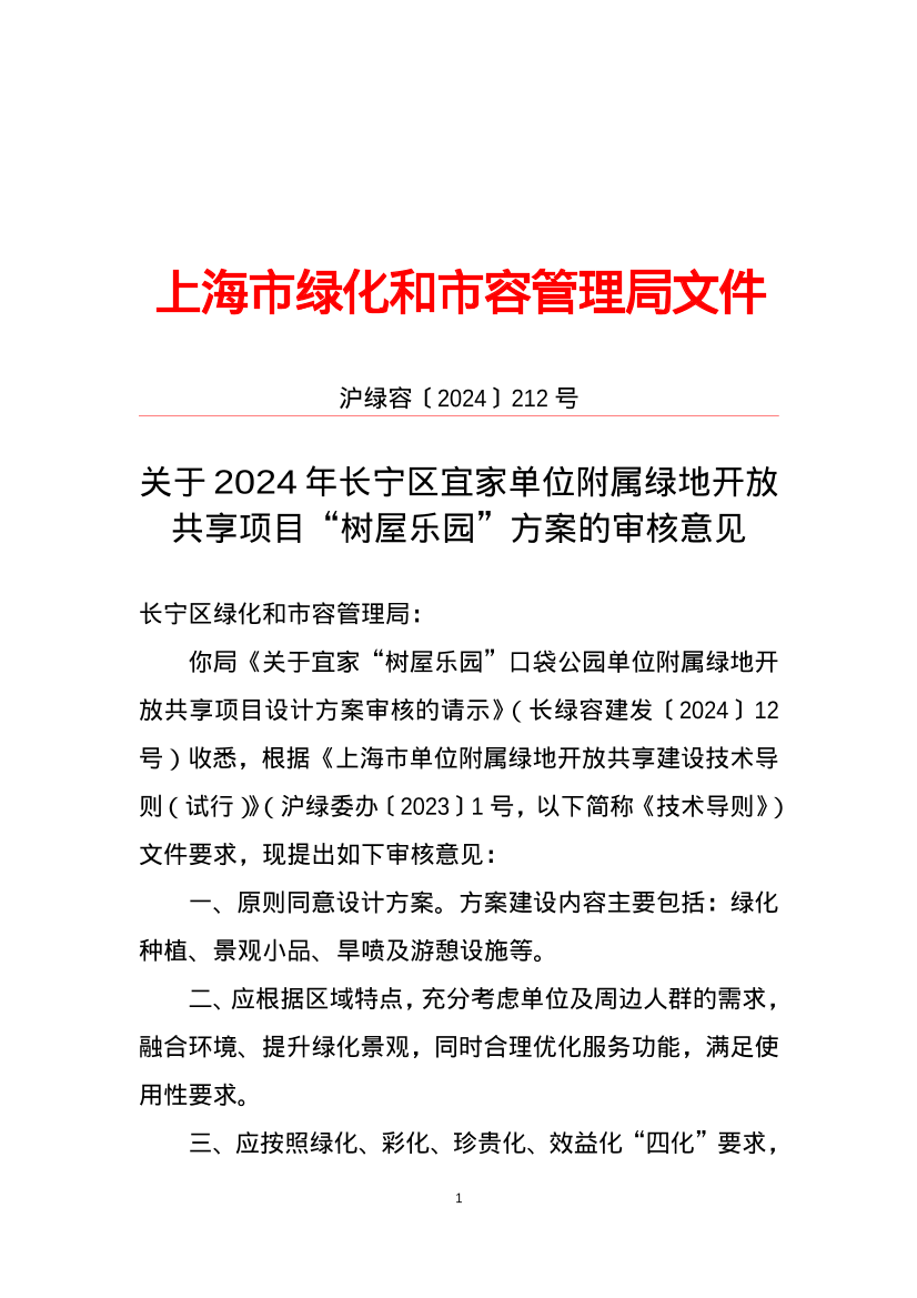 你局《关于宜家“树屋乐园”口袋公园单位附属绿地开放共享项目设计方案审核的请示》(长绿容建发〔2024〕12号)收悉,根据《上海市单位附属绿地开放共享建设技术导则(试行)》(沪绿委办〔2023〕1号,以下简称《技术导则》)文件要求,现提出如下审核意见:
