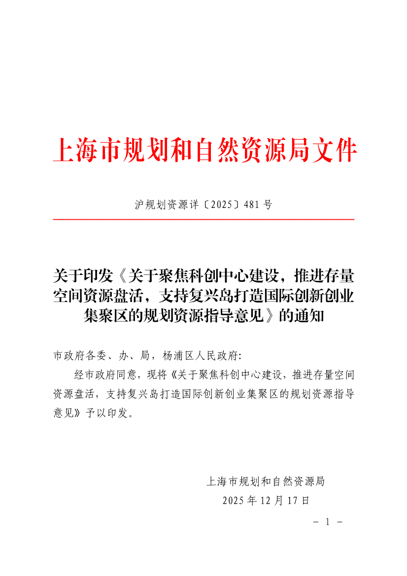 关于印发《关于聚焦科创中心建设,推进存量空间资源盘活,支持复兴岛打造国际创新创业集聚区的规划资源指导意见》的通知