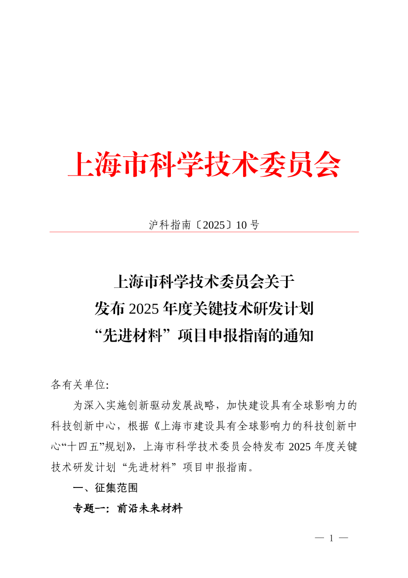 为深入实施创新驱动发展战略,加快建设具有全球影响力的科技创新中心,根据《上海市建设具有全球影响力的科技创新中心“十四五”规划》,上海市科学技术委员会特发布2025年度关键技术研发计划“先进材料”项目申报指南。