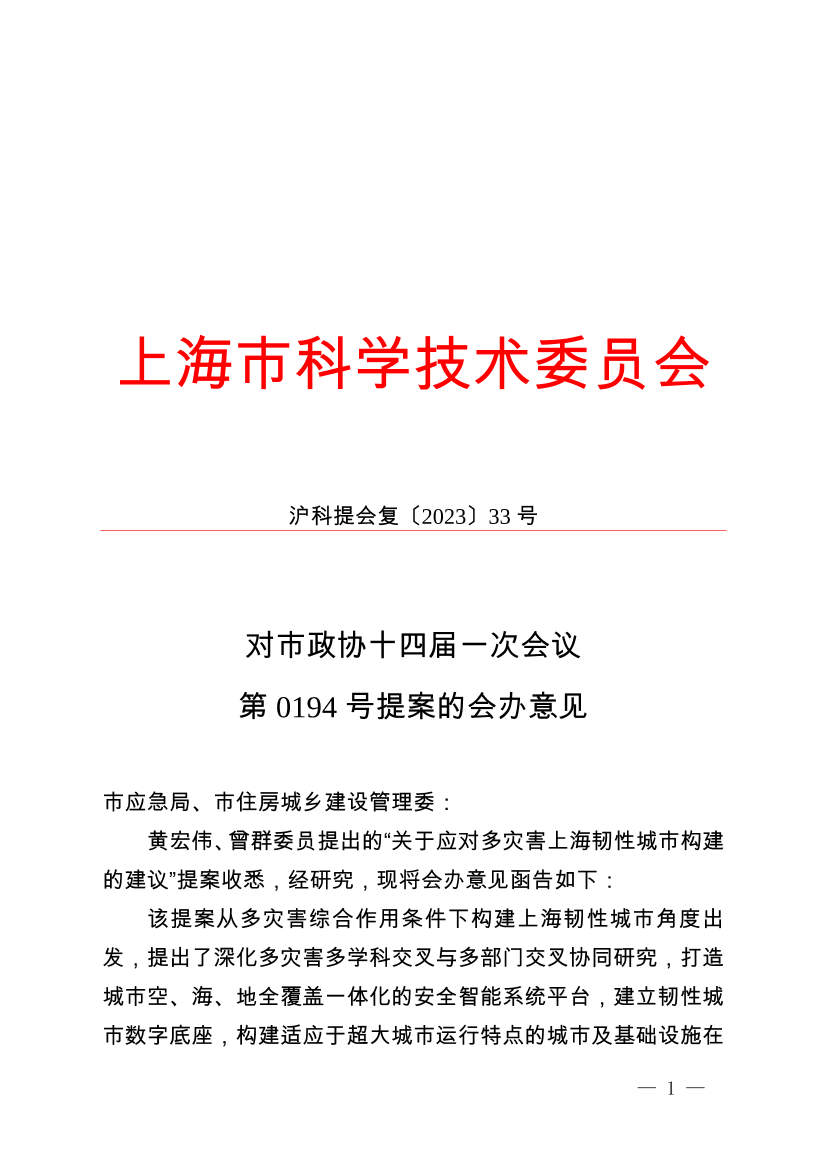 黄宏伟、曾群委员提出的“关于应对多灾害上海韧性城市构建的建议”提案收悉,经研究,现将会办意见函告如下: