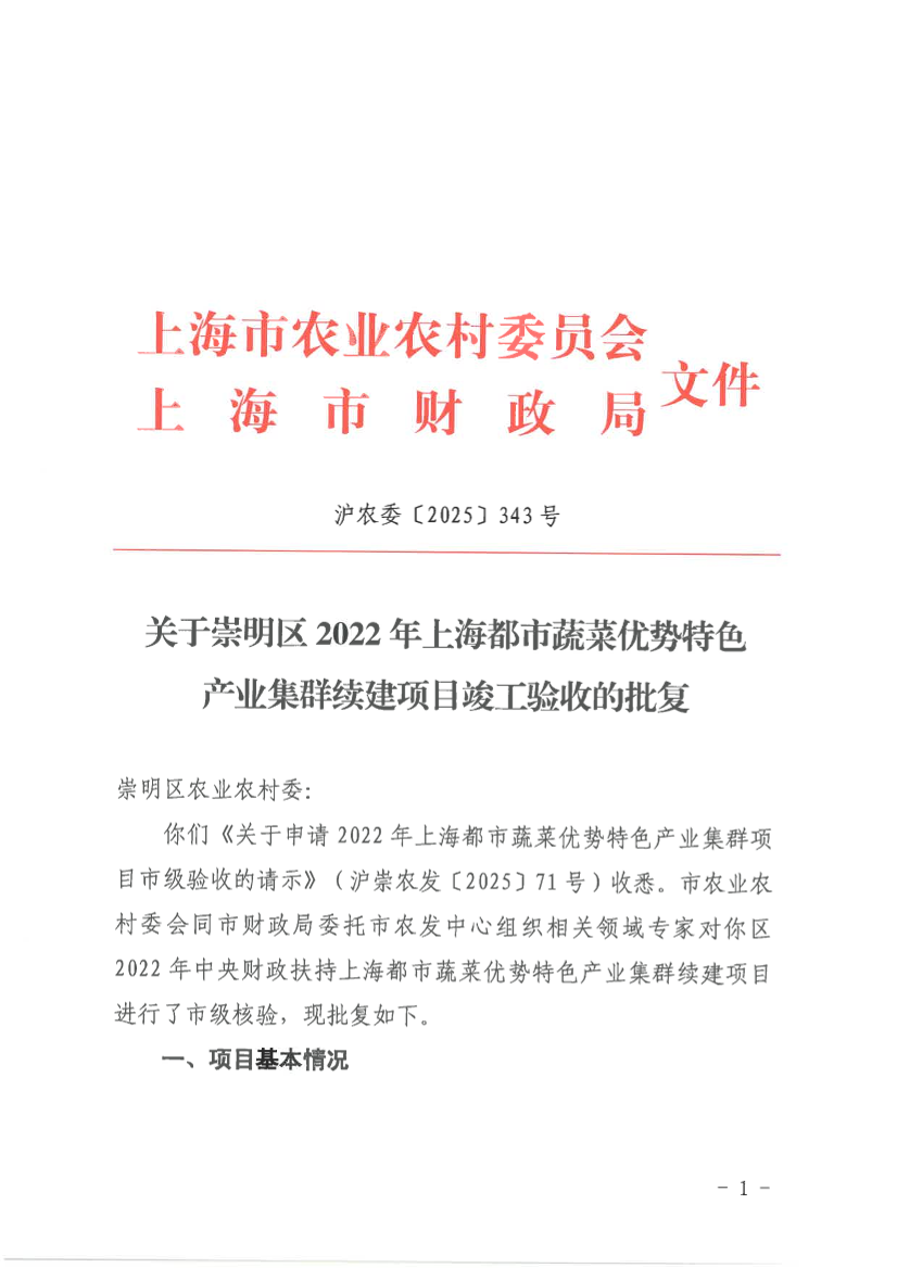 你们《关于申请2022年上海都市蔬菜优势特色产业集群项目市级验收的请示》(沪崇农发〔2025〕71号)收悉。市农业农村委会同市财政局委托市农发中心组织相关领域专家对你区2022年中央财政扶持上海都市蔬菜优势特色产业集群续建项目进行了市级核验,现批复如下。