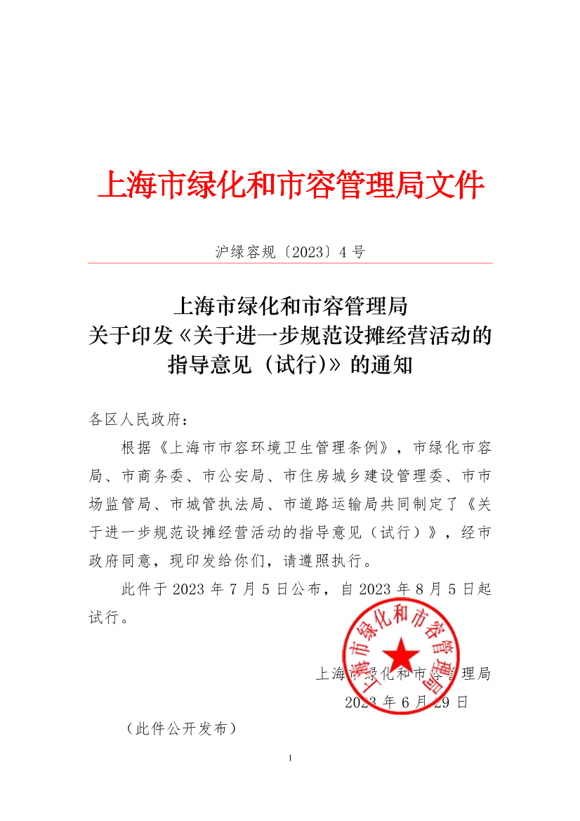 根据《上海市市容环境卫生管理条例》,市绿化市容局、市商务委、市公安局、市住房城乡建设管理委、市市场监管局、市城管执法局、市道路运输局共同制定了《关于进一步规范设摊经营活动的指导意见(试行)》,经市政府同意,现印发给你们,请遵照执行。