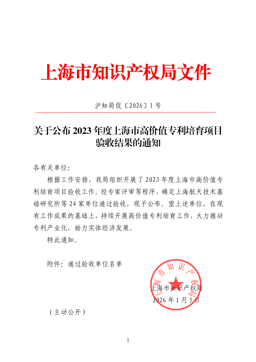根据工作安排,我局组织开展了2023年度上海市高价值专利培育项目验收工作。经专家评审等程序,确定上海航天技术基础研究所等24家单位通过验收,现予公布。望上述单位,在现有工作成果的基础上,持续开展高价值专利培育工作,大力推动专利产业化,助力实体经济发展。