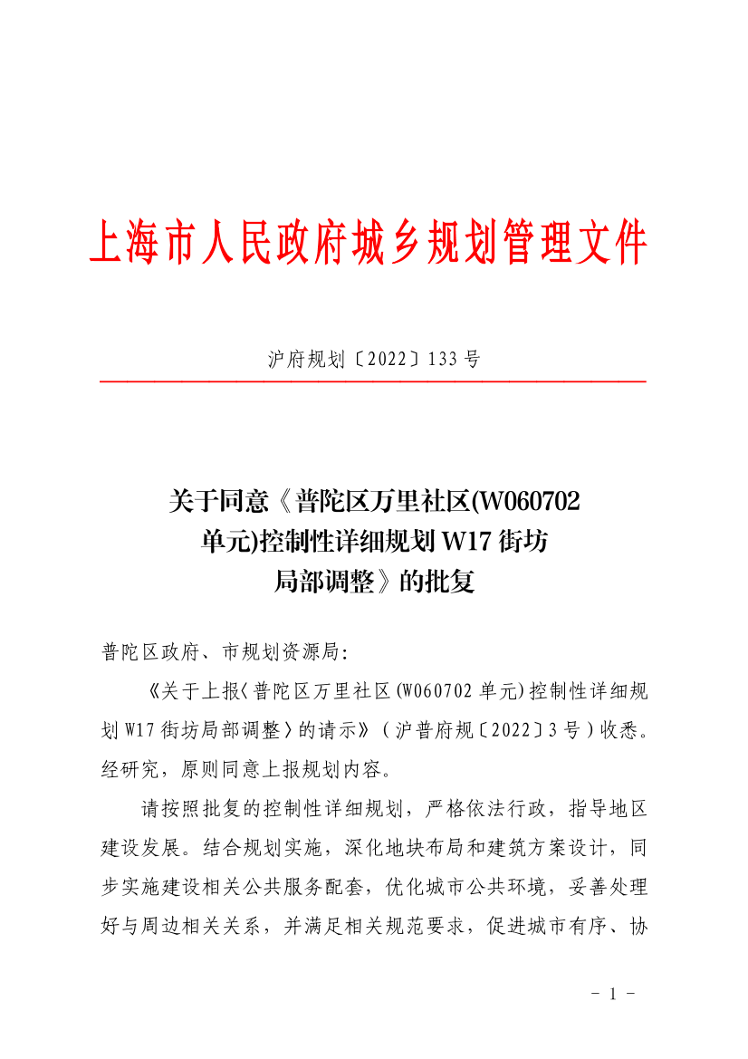 《关于上报〈普陀区万里社区(W060702单元)控制性详细规划W17街坊局部调整〉的请示》(沪普府规〔2022〕3号)收悉。经研究,原则同意上报规划内容。