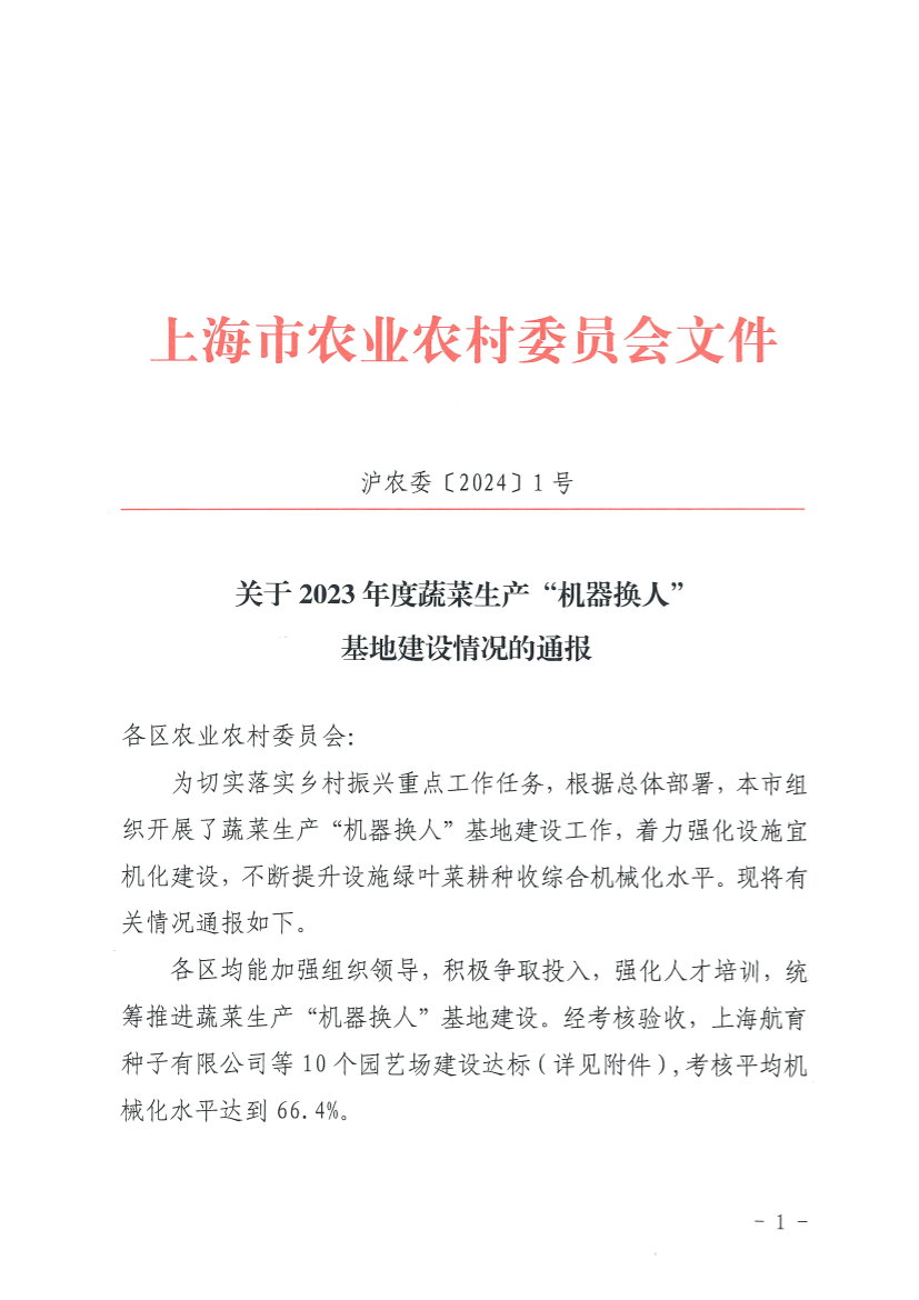 特别是宝山区、青浦区积极作为,各组织建设了2家基地并通过了考核验收,为全市蔬菜生产“机器换人”基地建设工作作出了表率;嘉定区、奉贤区,采取切实措施着力推进蔬菜生产“设施宜机化”“作业机械化”和“生产标准化”,示范成效显著。以上单位均予以通报表彰。