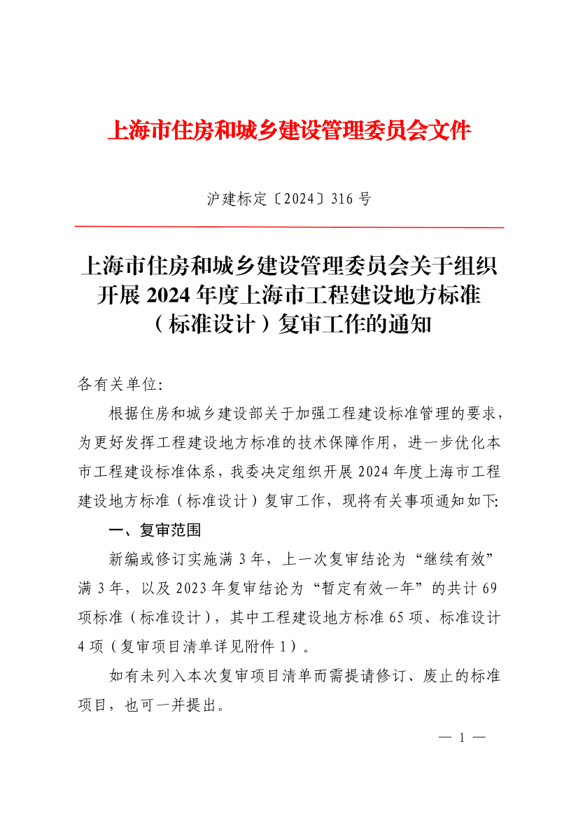 根据住房和城乡建设部关于加强工程建设标准管理的要求,为更好发挥工程建设地方标准的技术保障作用,进一步优化本市工程建设标准体系,我委决定组织开展2024年度上海市工程建设地方标准(标准设计)复审工作,现将有关事项通知如下: