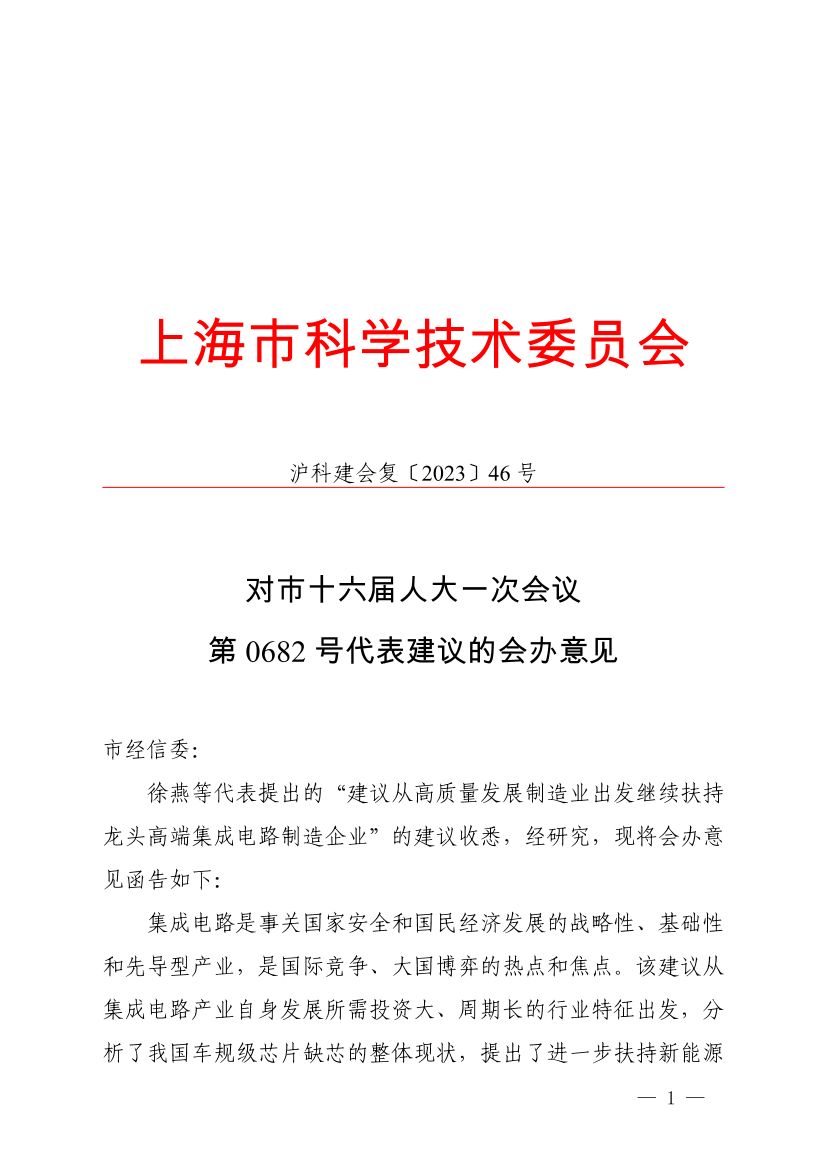徐燕等代表提出的“建议从高质量发展制造业出发继续扶持龙头高端集成电路制造企业”的建议收悉,经研究,现将会办意见函告如下: