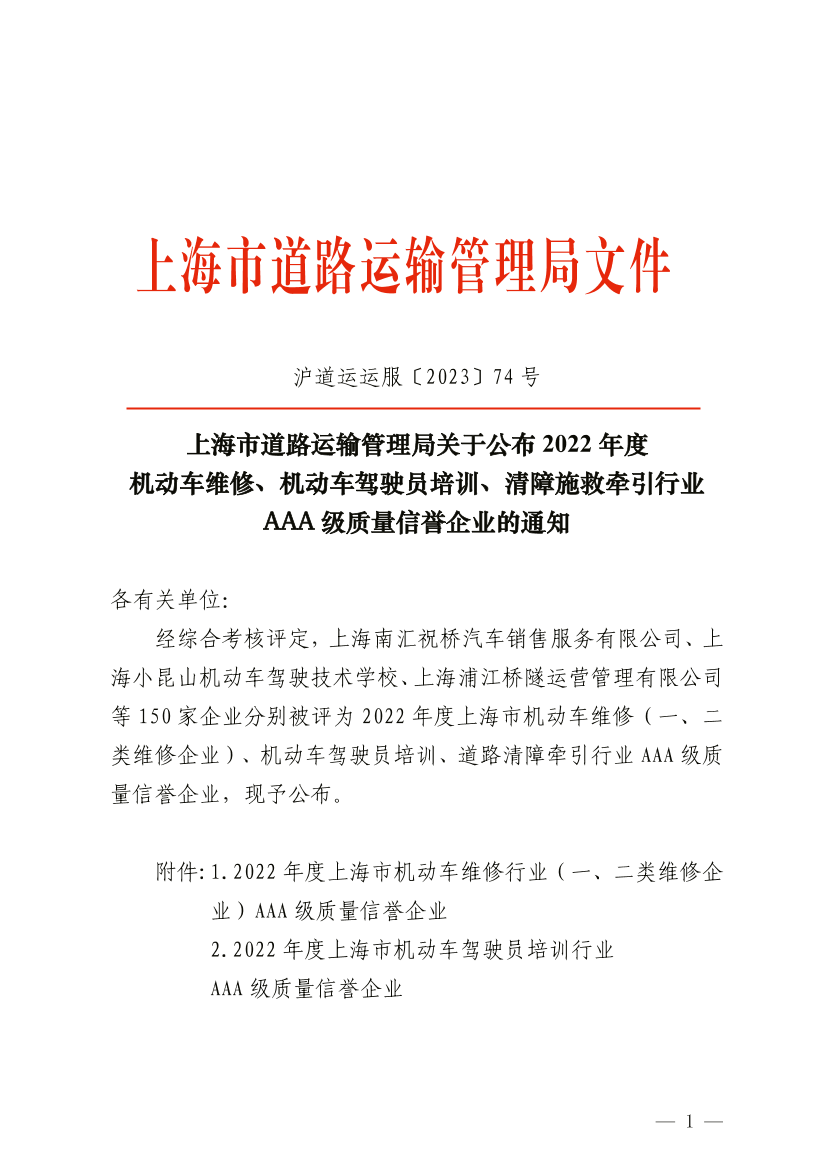 经综合考核评定,上海南汇祝桥汽车销售服务有限公司、上海小昆山机动车驾驶技术学校、上海浦江桥隧运营管理有限公司等150家企业分别被评为2022年度上海市机动车维修(一、二类维修企业)、机动车驾驶员培训、道路清障牵引行业AAA级质量信誉企业,现予公布。