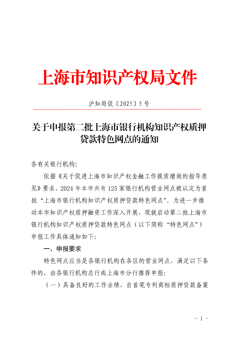 依据《关于促进上海市知识产权金融工作提质增效的指导意见》要求,2024年本市共有125家银行机构营业网点被认定为首批“上海市银行机构知识产权质押贷款特色网点”。为进一步推动本市知识产权质押融资工作深入开展,现就启动第二批上海市银行机构知识产权质押贷款特色网点(以下简称“特色网点”)申报工作具体通知如下: