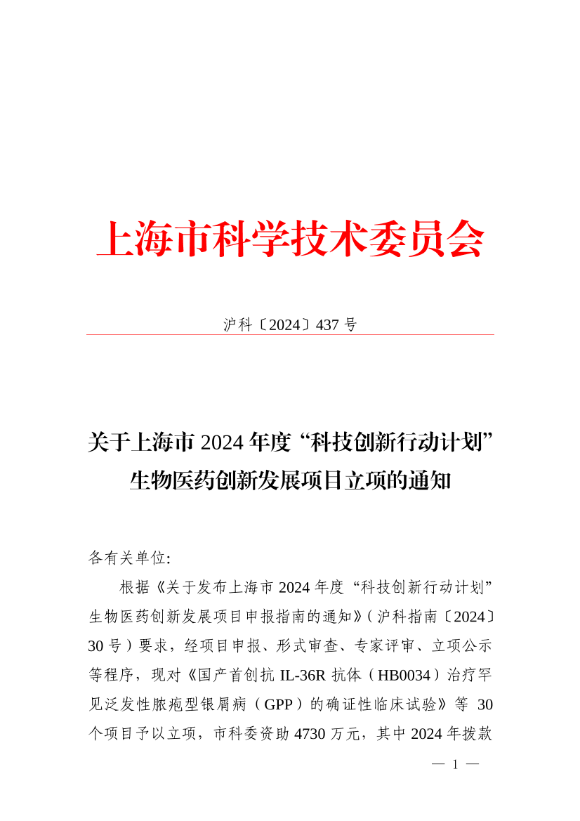根据《关于发布上海市2024年度“科技创新行动计划”生物医药创新发展项目申报指南的通知》(沪科指南〔2024〕30号)要求,经项目申报、形式审查、专家评审、立项公示等程序,现对《国产首创抗IL-36R抗体(HB0034)治疗罕见泛发性脓疱型银屑病(GPP)的确证性临床试验》等30个项目予以立项,市科委资助4730万元,其中2024年拨款3784万元。请各项目承担单位做好项目组织实施和管理工作,确保按期完成项目研究任务目标。