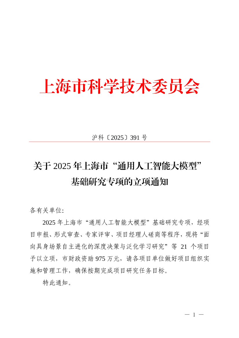 2025年上海市“通用人工智能大模型”基础研究专项,经项目申报、形式审查、专家评审、项目经理人磋商等程序,现将“面向具身场景自主进化的深度决策与泛化学习研究”等21个项目予以立项,市财政资助975万元,请各项目单位做好项目组织实施和管理工作,确保按期完成项目研究任务目标。