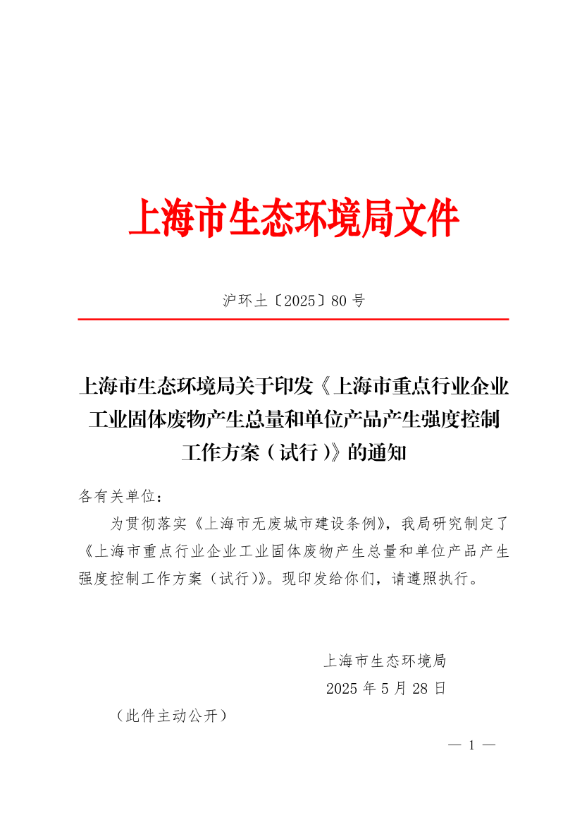 上海市重点行业企业工业固体废物产生总量和单位产品产生强度控制工作方案(试行)