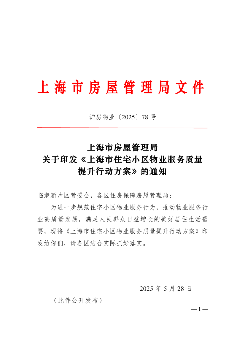 为进一步规范住宅小区物业服务行为,推动物业服务行业高质量发展,满足人民群众日益增长的美好居住生活需要,现将《上海市住宅小区物业服务质量提升行动方案》印发给你们,请各区结合实际抓好落实。