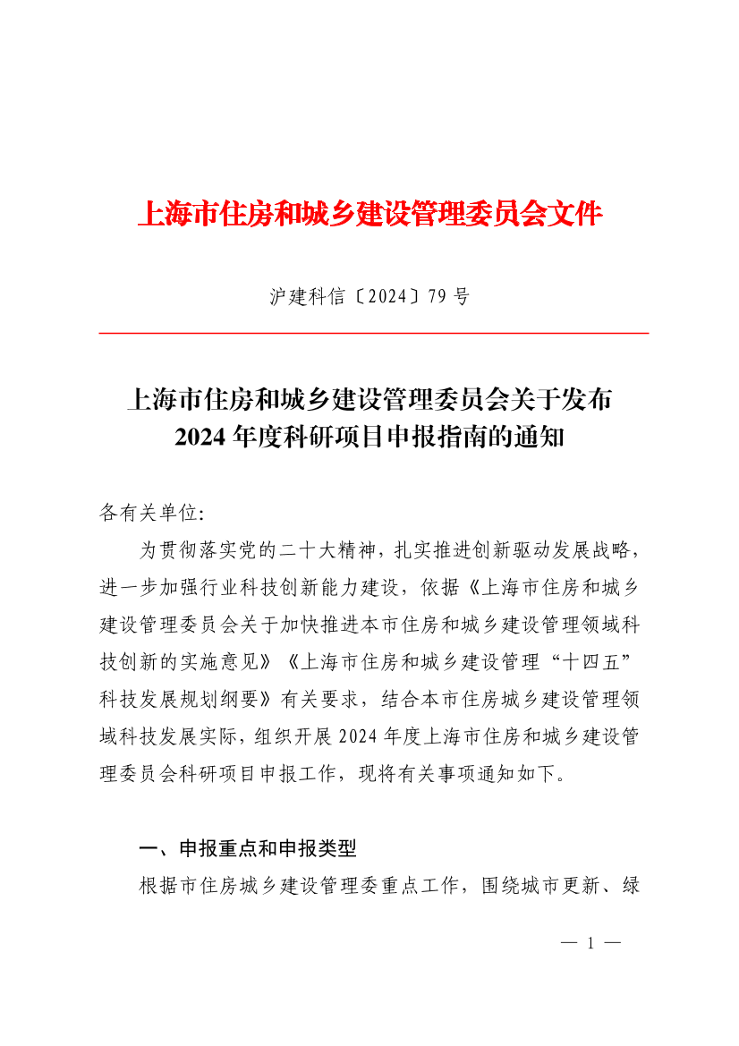 为贯彻落实党的二十大精神,扎实推进创新驱动发展战略,进一步加强行业科技创新能力建设,依据《上海市住房和城乡建设管理委员会关于加快推进本市住房和城乡建设管理领域科技创新的实施意见》《上海市住房和城乡建设管理“十四五”科技发展规划纲要》有关要求,结合本市住房城乡建设管理领域科技发展实际,组织开展2024年度上海市住房和城乡建设管理委员会科研项目申报工作,现将有关事项通知如下。