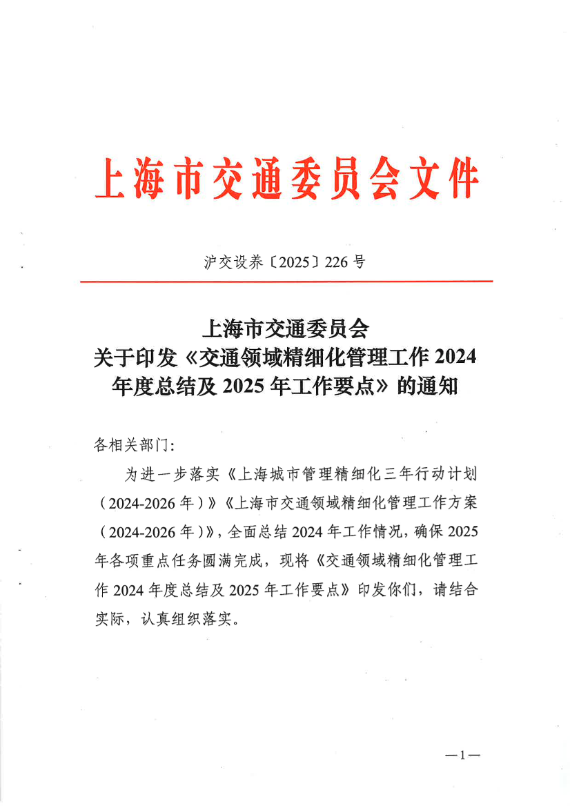 为进一步落实《上海城市管理精细化三年行动计划(2024-2026年)》《上海市交通领域精细化管理工作方案(2024-2026年)》,全面总结2024年工作情况,确保2025年各项重点任务圆满完成,现将《交通领域城市精细化管理工作2024年度总结及2025年工作要点》印发你们,请结合实际,认真组织落实。