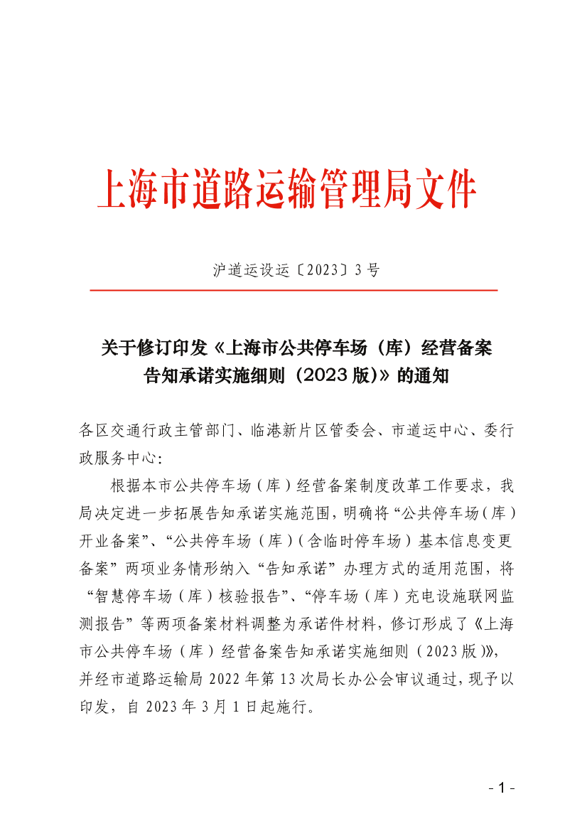 两项业务情形纳入“告知承诺”办理方式的适用范围,将“智慧停车场(库)核验报告”、“停车场(库)充电设施联网监测报告”等两项备案材料调整为承诺件材料,修订形成了《上海市公共停车场(库)经营备案告知承诺实施细则(2023版)》,并经市道路运输局2022年第13次局长办公会审议通过,现予以印发,自2023年3月1日起施行。