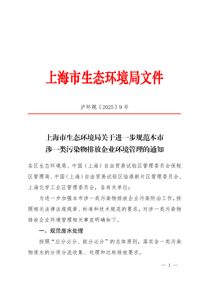 为进一步加强本市涉一类污染物排放企业污染防治工作,按照相关法律法规规章、标准和技术规范的要求,对涉一类污染物排放企业环境管理相关事宜明确如下。