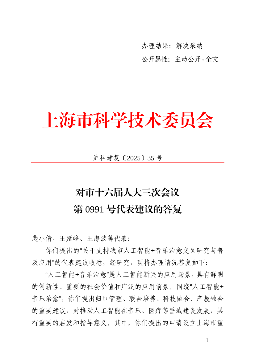 “人工智能+音乐治愈”是人工智能新兴的应用场景,具有鲜明的创新性、重要的社会价值和广泛的应用前景。围绕“人工智能+音乐治愈”,你们提出归口管理、联合培养、科技融合、产教融合的重要建议,对推动人工智能在音乐、医疗等垂域建设发展,具有重要的启发和指导意义。其中,你们提出的申请设立上海市重点实验室,推进高新技术成果认定的具体建议,属于我委工作的职能范畴和重要内容。我们将认真学习汲取各位代表的建议,充分融入上海国际科技创新中心建设工作中。
