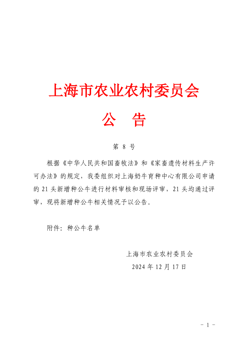 根据《中华人民共和国畜牧法》和《家畜遗传材料生产许可办法》的规定,我委组织对上海奶牛育种中心有限公司申请的21头新增种公牛进行材料审核和现场评审,21头均通过评审,现将新增种公牛相关情况予以公告。