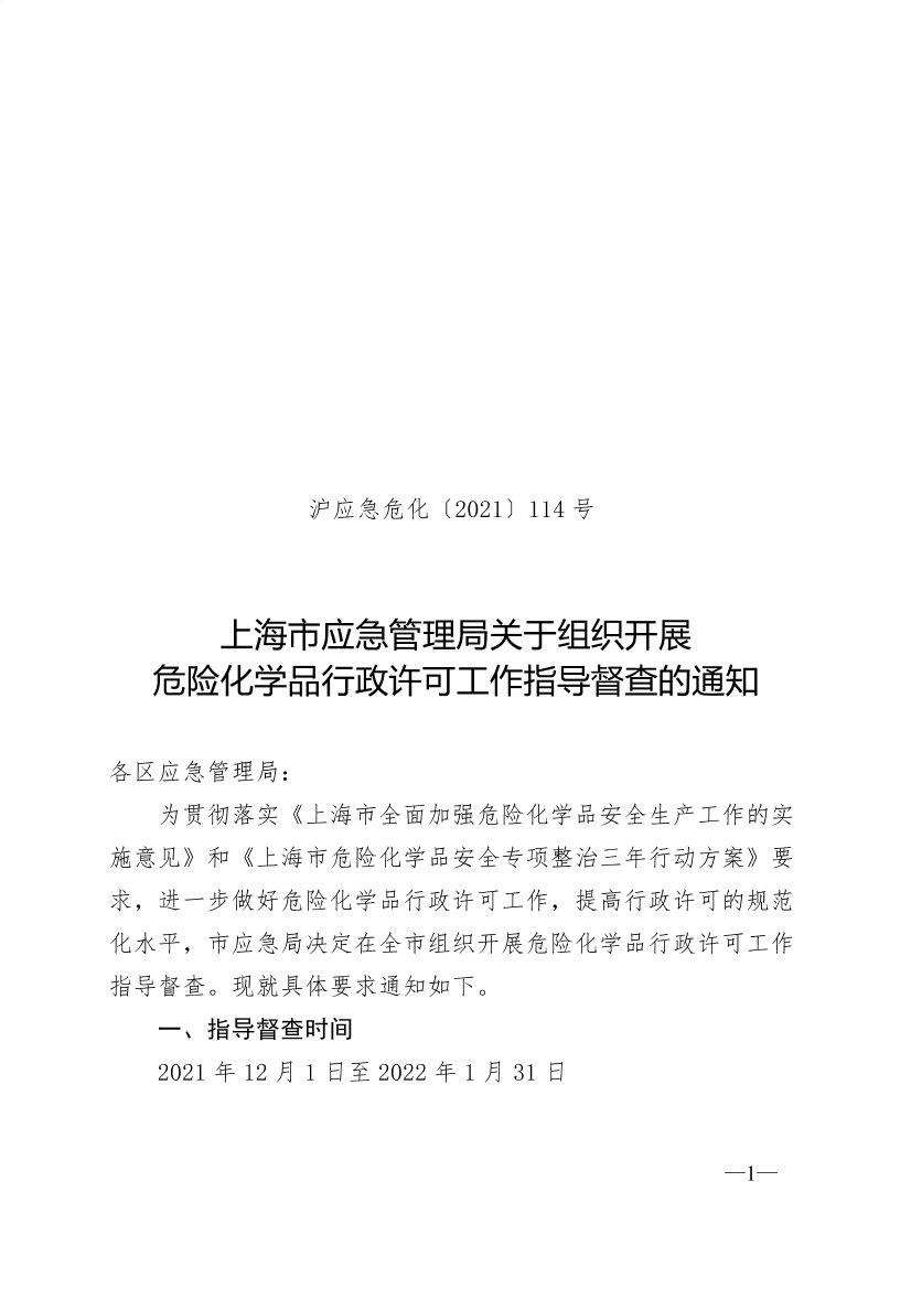 为贯彻落实《上海市全面加强危险化学品安全生产工作的实施意见》和《上海市危险化学品安全专项整治三年行动方案》要求,进一步做好危险化学品行政许可工作,提高行政许可的规范化水平,市应急局决定在全市组织开展危险化学品行政许可工作指导督查。现就具体要求通知如下。