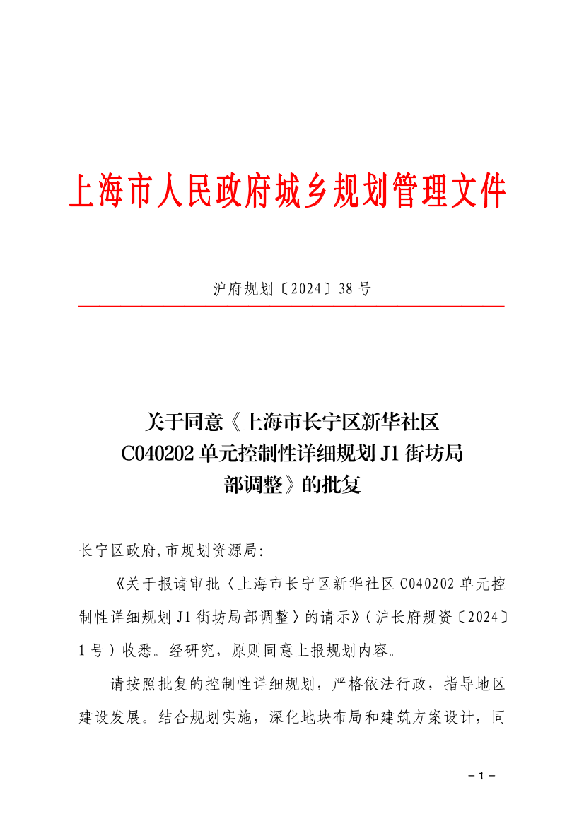 《关于报请审批〈上海市长宁区新华社区C040202单元控制性详细规划J1街坊局部调整〉的请示》(沪长府规资〔2024〕1号)收悉。经研究,原则同意上报规划内容。