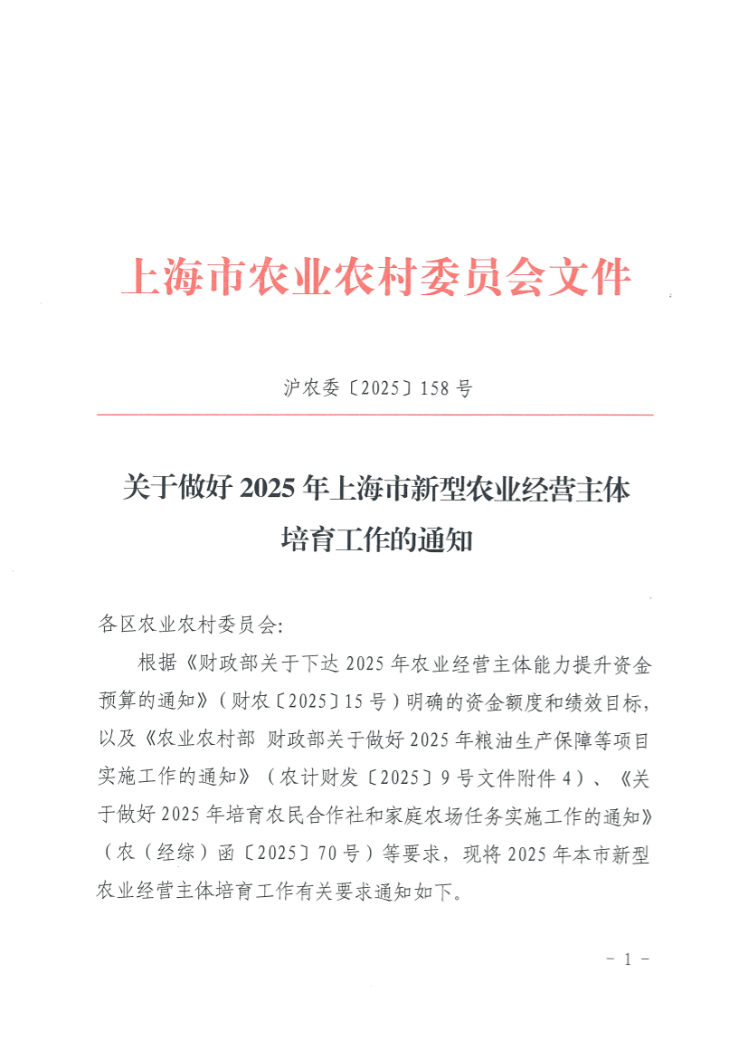 根据《财政部关于下达2025年农业经营主体能力提升资金预算的通知》(财农〔2025〕15号)明确的资金额度和绩效目标,以及《农业农村部 财政部关于做好2025年粮油生产保障等项目实施工作的通知》(农计财发〔2025〕9号文件附件4)、《关于做好2025年培育农民合作社和家庭农场任务实施工作的通知》(农(经综)函〔2025〕70号)等要求,现将2025年本市新型农业经营主体培育工作有关要求通知如下。