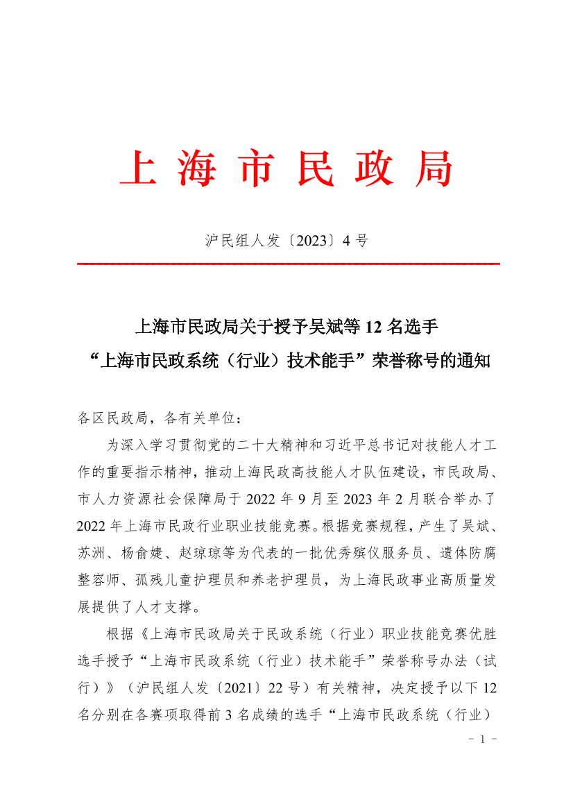 根据《上海市民政局关于民政系统(行业)职业技能竞赛优胜选手授予“上海市民政系统(行业)技术能手”荣誉称号办法(试行)》(沪民组人发〔2021〕22号)有关精神,决定授予以下12名分别在各赛项取得前3名成绩的选手“上海市民政系统(行业)技术能手”荣誉称号: