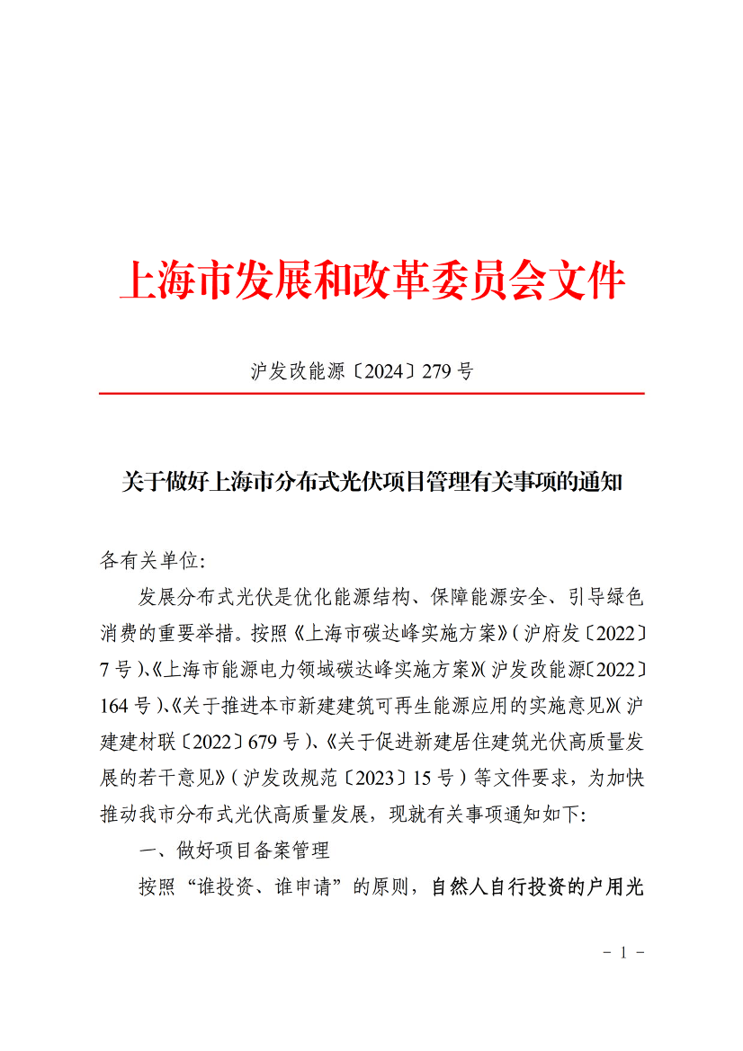 发展分布式光伏是优化能源结构、保障能源安全、引导绿色消费的重要举措。按照《上海市碳达峰实施方案》(沪府发〔2022〕7号)、《上海市能源电力领域碳达峰实施方案》(沪发改能源〔2022〕164号)、《关于推进本市新建建筑可再生能源应用的实施意见》(沪建建材联〔2022〕679号)、《关于促进新建居住建筑光伏高质量发展的若干意见》(沪发改规范〔2023〕15号)等文件要求,为加快推动我市分布式光伏高质量发展,现就有关事项通知如下: