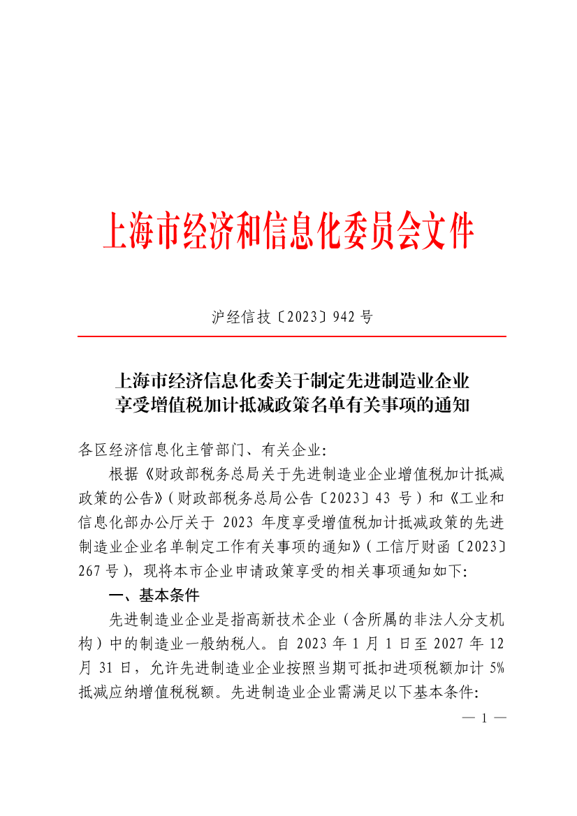 根据《财政部税务总局关于先进制造业企业增值税加计抵减政策的公告》(财政部税务总局公告〔2023〕43号)和《工业和信息化部办公厅关于2023年度享受增值税加计抵减政策的先进制造业企业名单制定工作有关事项的通知》(工信厅财函〔2023〕267号),现将本市企业申请政策享受的相关事项通知如下: