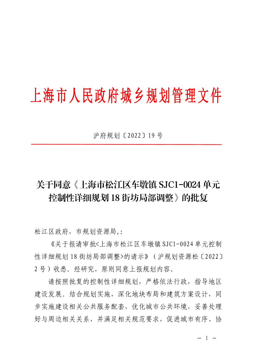 《关于报请审批<上海市松江区车墩镇SJC1-0024单元控制性详细规划18街坊局部调整>的请示》(沪规划资源松〔2022〕2号)收悉。经研究,原则同意上报规划内容。