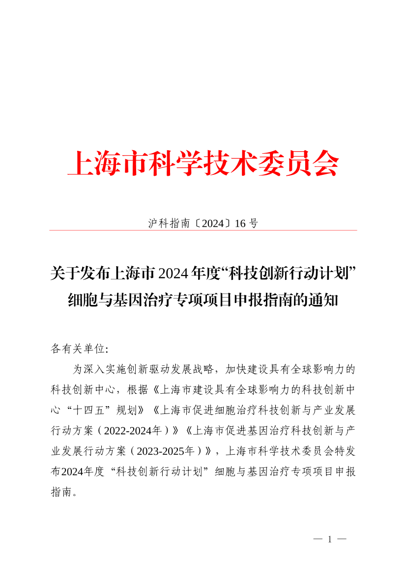 为深入实施创新驱动发展战略,加快建设具有全球影响力的科技创新中心,根据《上海市建设具有全球影响力的科技创新中心“十四五”规划》《上海市促进细胞治疗科技创新与产业发展行动方案(2022-2024年)》《上海市促进基因治疗科技创新与产业发展行动方案(2023-2025年)》,上海市科学技术委员会特发布2024年度“科技创新行动计划”细胞与基因治疗专项项目申报指南。