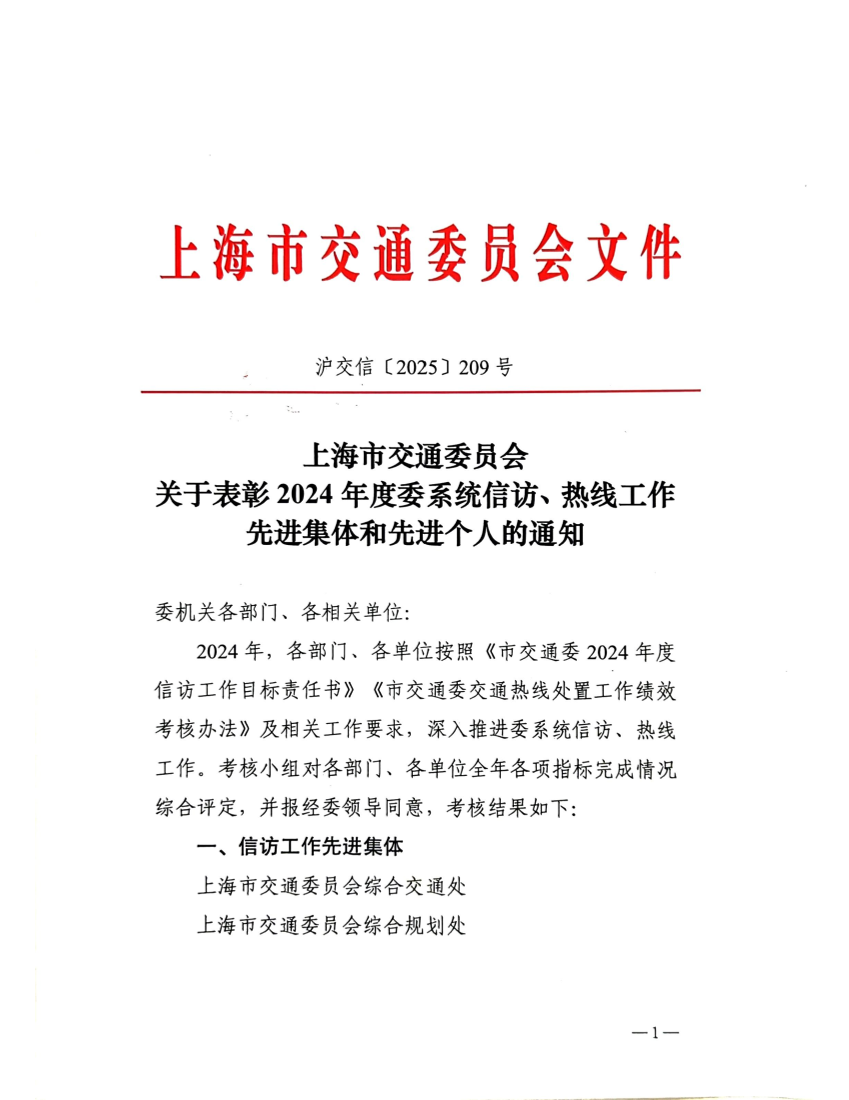 上海市交通委员会关于表彰2024年度委系统信访、热线工作先进集体和先进个人的通知