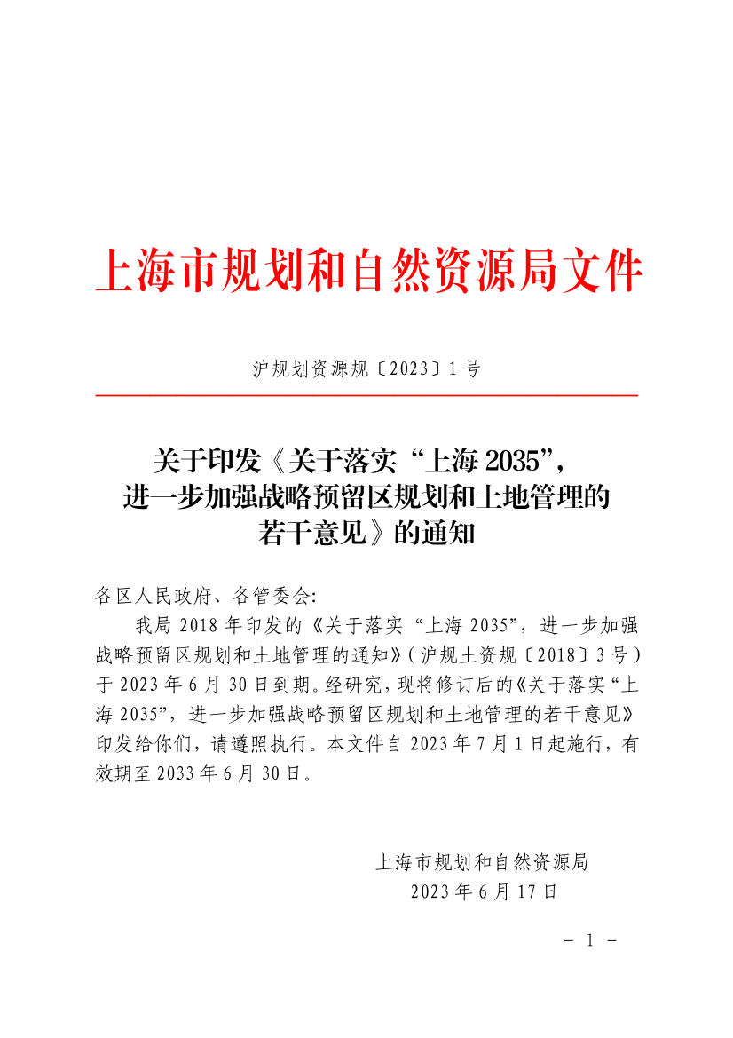 我局2018年印发的《关于落实“上海2035”,进一步加强战略预留区规划和土地管理的通知》(沪规土资规〔2018〕3号)于2023年6月30日到期。经研究,现将修订后的《关于落实“上海2035”,进一步加强战略预留区规划和土地管理的若干意见》印发给你们,请遵照执行。本文件自2023年7月1日起施行,有效期至2033年6月30日。