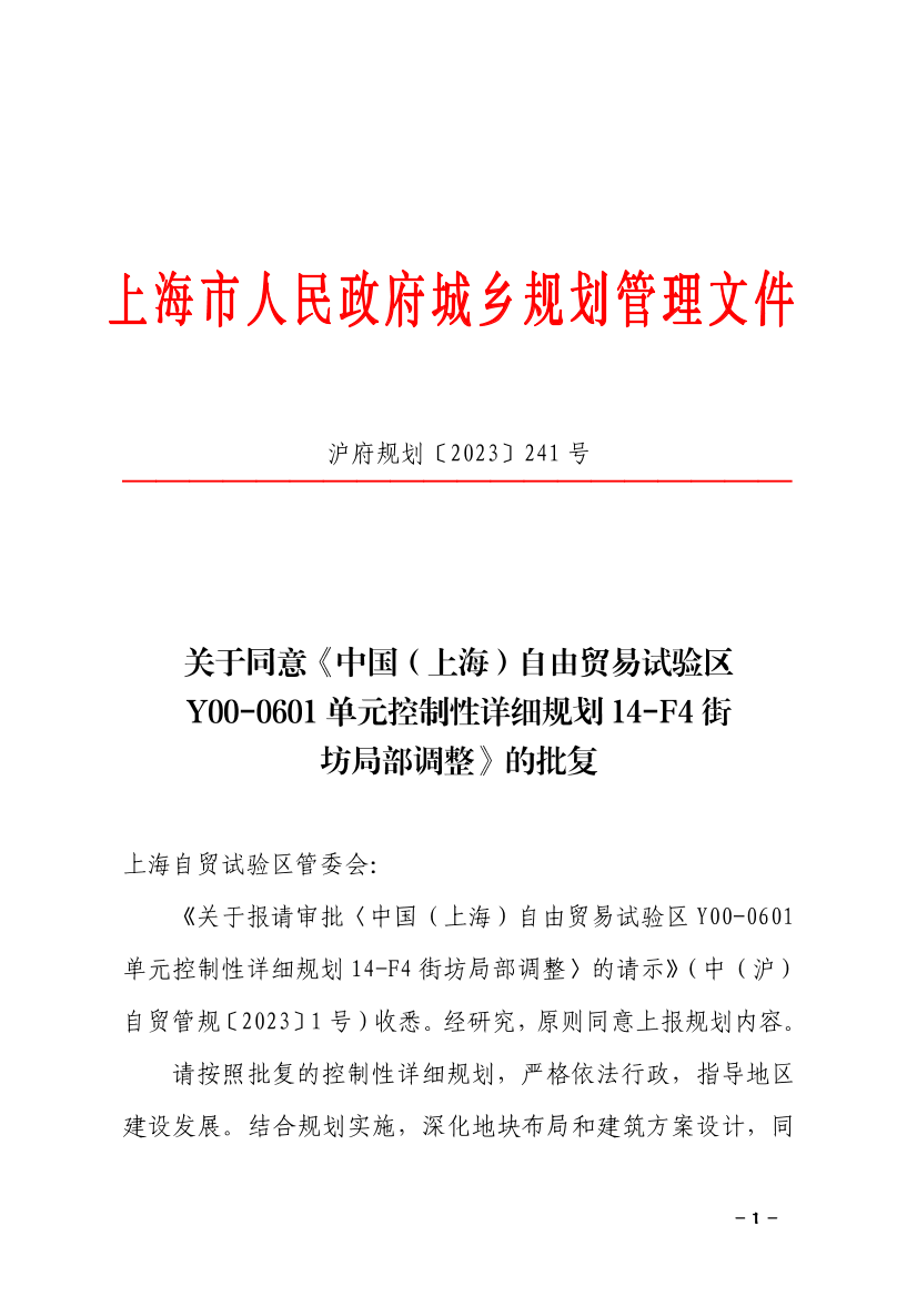 《关于报请审批〈中国(上海)自由贸易试验区Y00-0601单元控制性详细规划14-F4街坊局部调整〉的请示》(中(沪)自贸管规〔2023〕1号)收悉。经研究,原则同意上报规划内容。