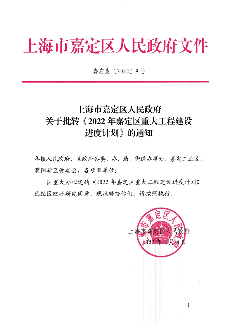 区重大办拟定的《2022年嘉定区重大工程建设进度计划》已经区政府研究同意,现批转给你们,请按照执行。