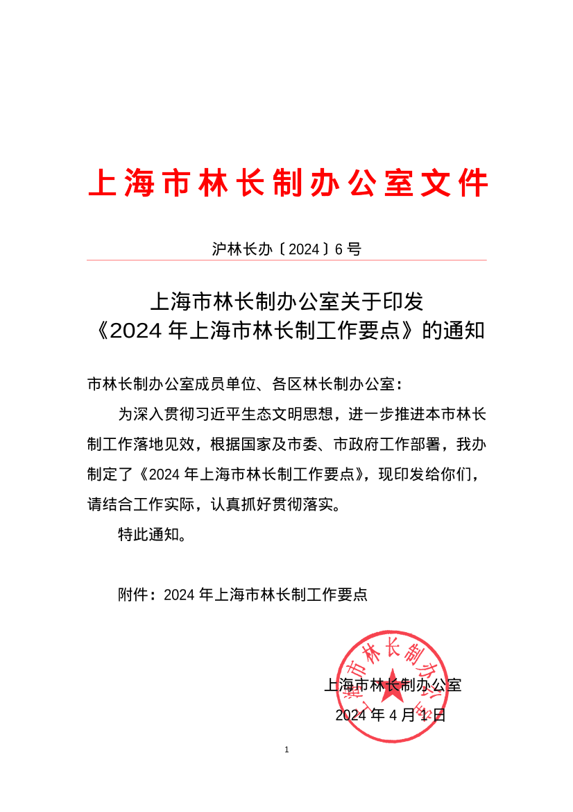 为深入贯彻习近平生态文明思想,进一步推进本市林长制工作落地见效,根据国家及市委、市政府工作部署,我办制定了《2024年上海市林长制工作要点》,现印发给你们,请结合工作实际,认真抓好贯彻落实。