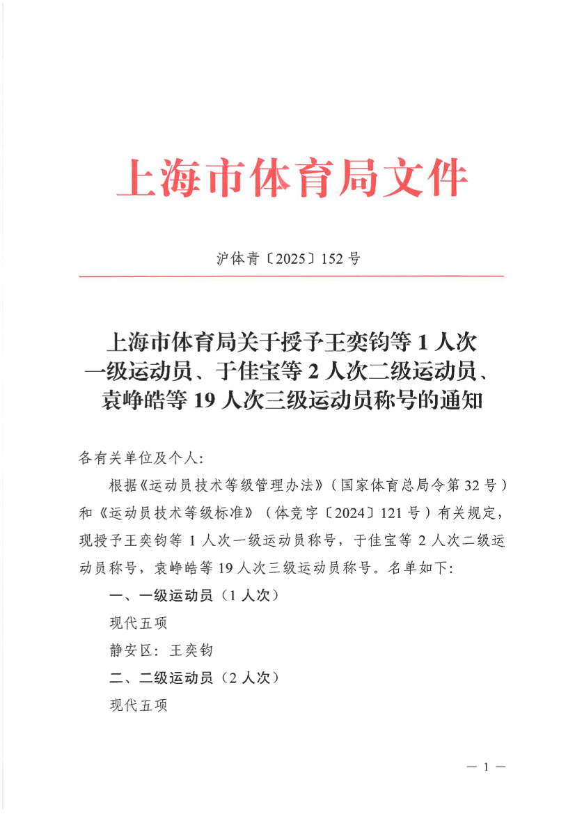 根据《运动员技术等级管理办法》(国家体育总局令第32号)和《运动员技术等级标准》(体竞字〔2024〕121号)有关规定,现授予王奕钧等1人次一级运动员称号,于佳宝等2人次二级运动员称号,袁峥皓等19人次三级运动员称号。名单如下: