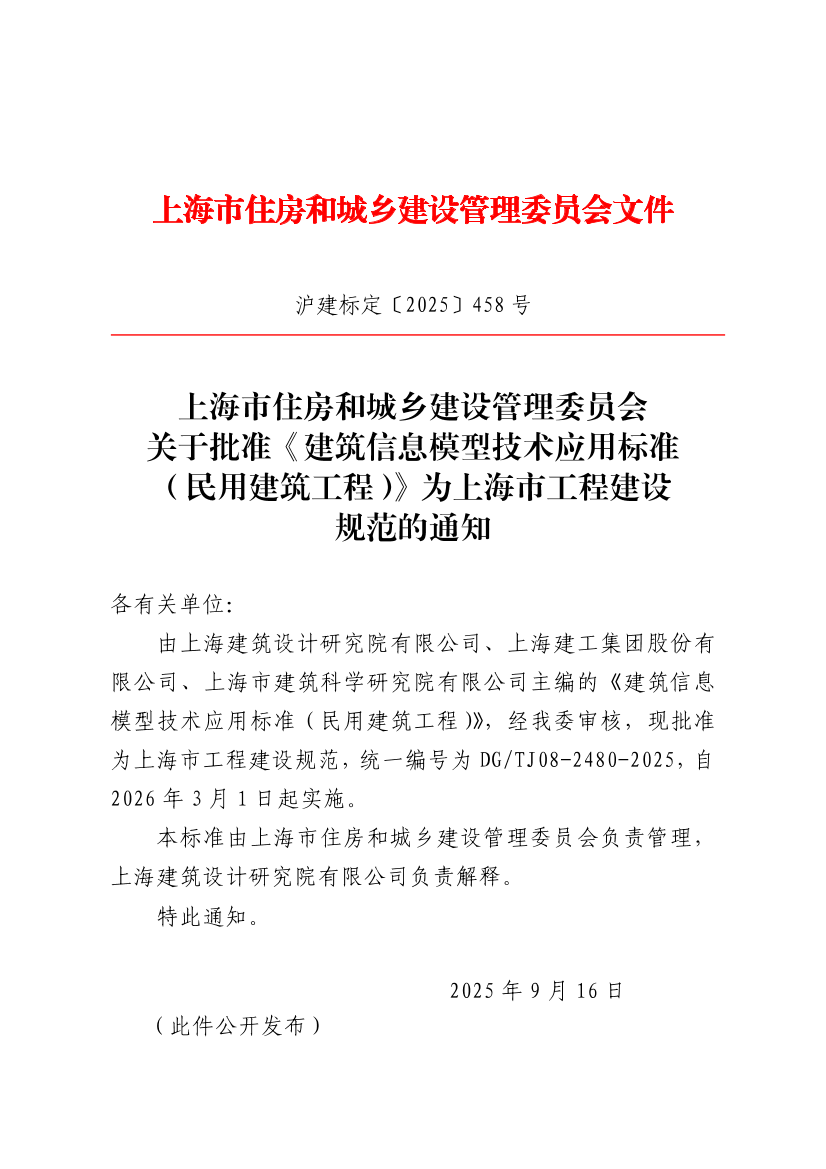 由上海建筑设计研究院有限公司、上海建工集团股份有限公司、上海市建筑科学研究院有限公司主编的《建筑信息模型技术应用标准(民用建筑工程)》,经我委审核,现批准为上海市工程建设规范,统一编号为DG/TJ08-2480-2025,自2026年3月1日起实施。