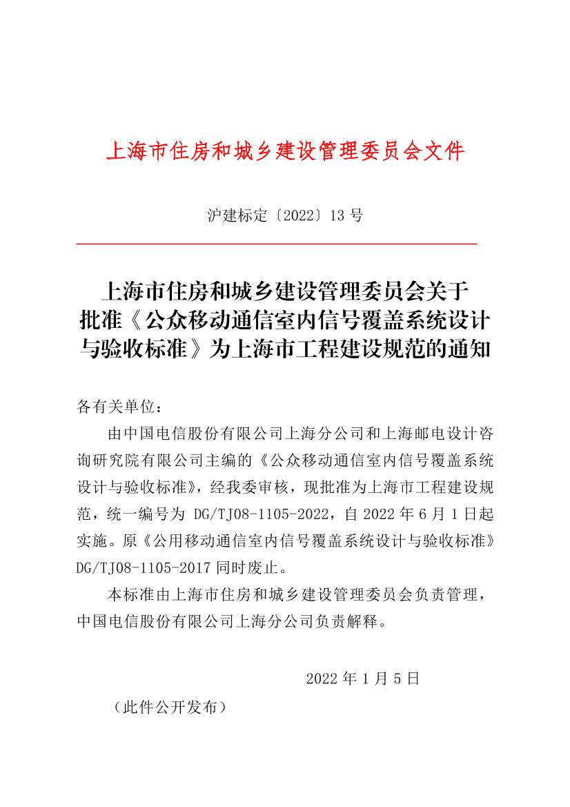 由中国电信股份有限公司上海分公司和上海邮电设计咨询研究院有限公司主编的《公众移动通信室内信号覆盖系统设计与验收标准》,经我委审核,现批准为上海市工程建设规范,统一编号为DG/TJ08-1105-2022,自2022年6月1日起实施。原《公用移动通信室内信号覆盖系统设计与验收标准》 DG/TJ08-1105-2017 同时废止。