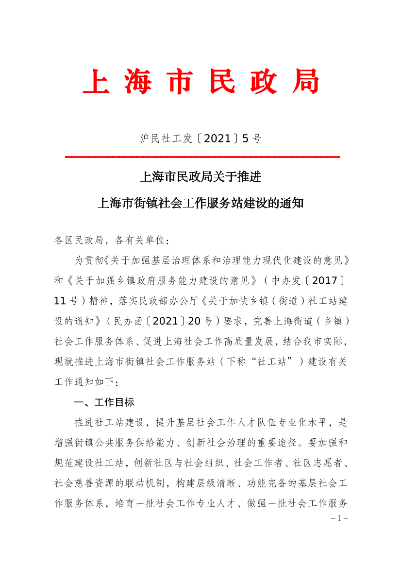为贯彻《关于加强基层治理体系和治理能力现代化建设的意见》和《关于加强乡镇政府服务能力建设的意见》(中办发〔2017〕11号)精神,落实民政部办公厅《关于加快乡镇(街道)社工站建设的通知》(民办函〔2021〕20号)要求,完善上海街道(乡镇)社会工作服务体系、促进上海社会工作高质量发展,结合我市实际,现就推进上海市街镇社会工作服务站(下称“社工站”)建设有关工作通知如下: