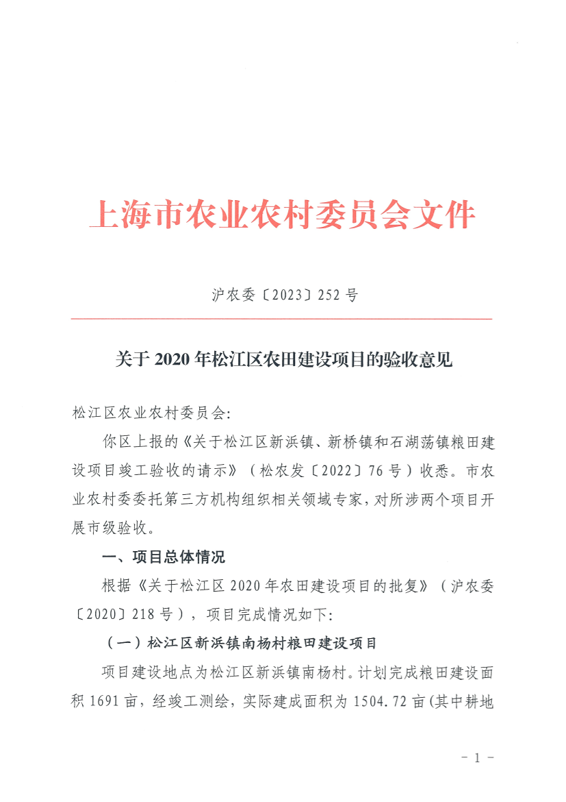 你区上报的《关于松江区新浜镇、新桥镇和石湖荡镇粮田建设项目竣工验收的请示》(松农发〔2022〕76号)收悉。市农业农村委委托第三方机构组织相关领域专家,对所涉两个项目开展市级验收。