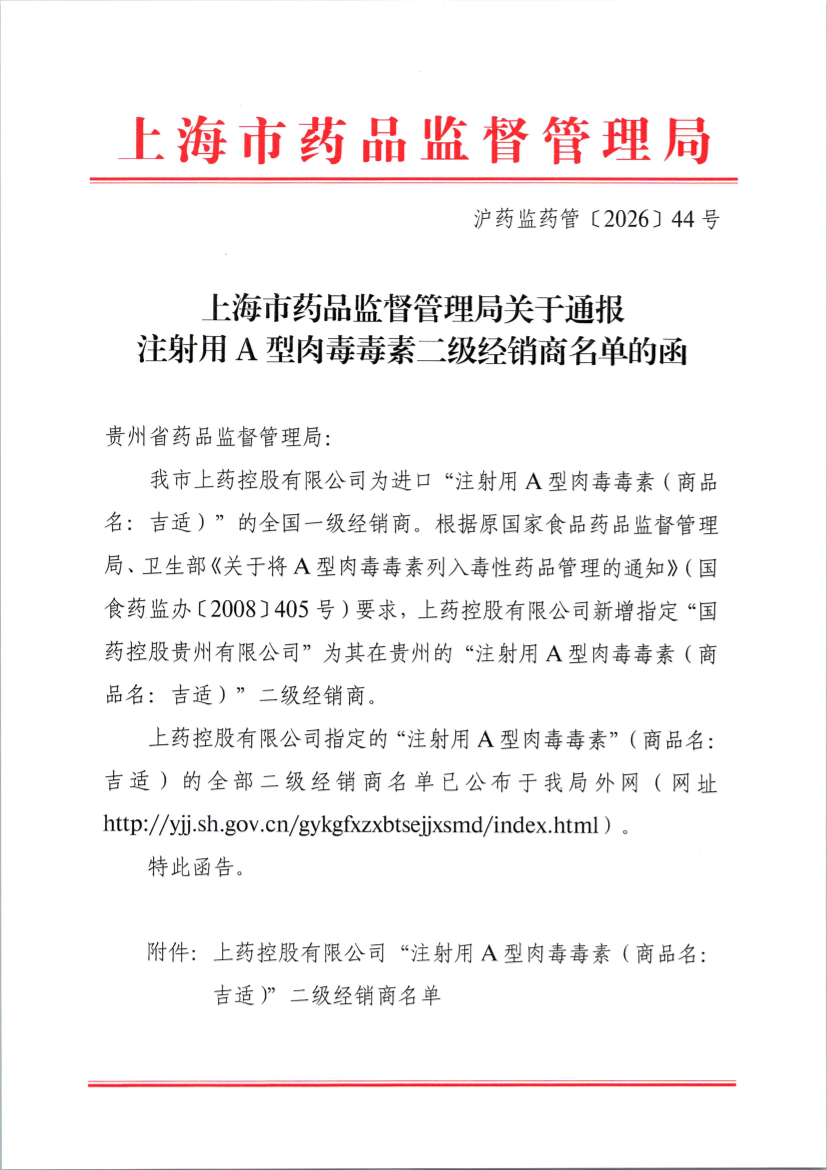 我市上药控股有限公司为进口“注射用A型肉毒毒素(商品名:吉适)”的全国一级经销商。根据原国家食品药品监督管理局、卫生部《关于将A型肉毒毒素列入毒性药品管理的通知》(国食药监办〔2008〕405号)要求,上药控股有限公司新增指定“国药控股贵州有限公司”为其在贵州的“注射用A型肉毒毒素(商品名:吉适)”二级经销商。