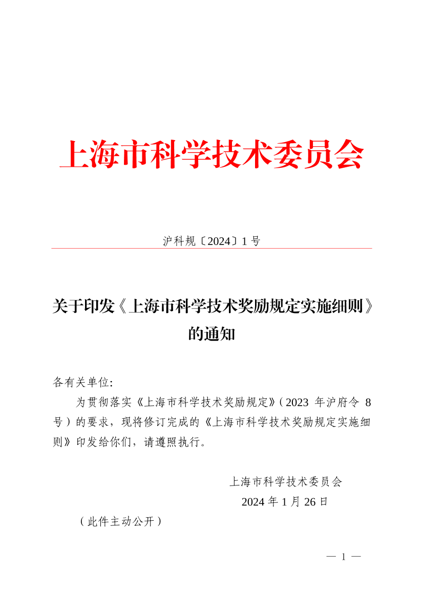 为贯彻落实《上海市科学技术奖励规定》(2023年沪府令8号)的要求,现将修订完成的《上海市科学技术奖励规定实施细则》印发给你们,请遵照执行。