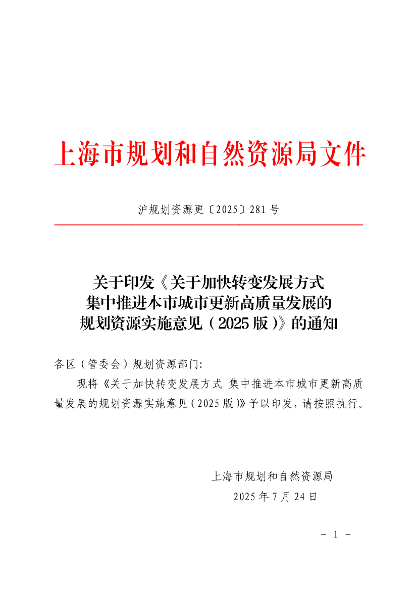 现将《关于加快转变发展方式 集中推进本市城市更新高质量发展的规划资源实施意见(2025版)》予以印发,请按照执行。