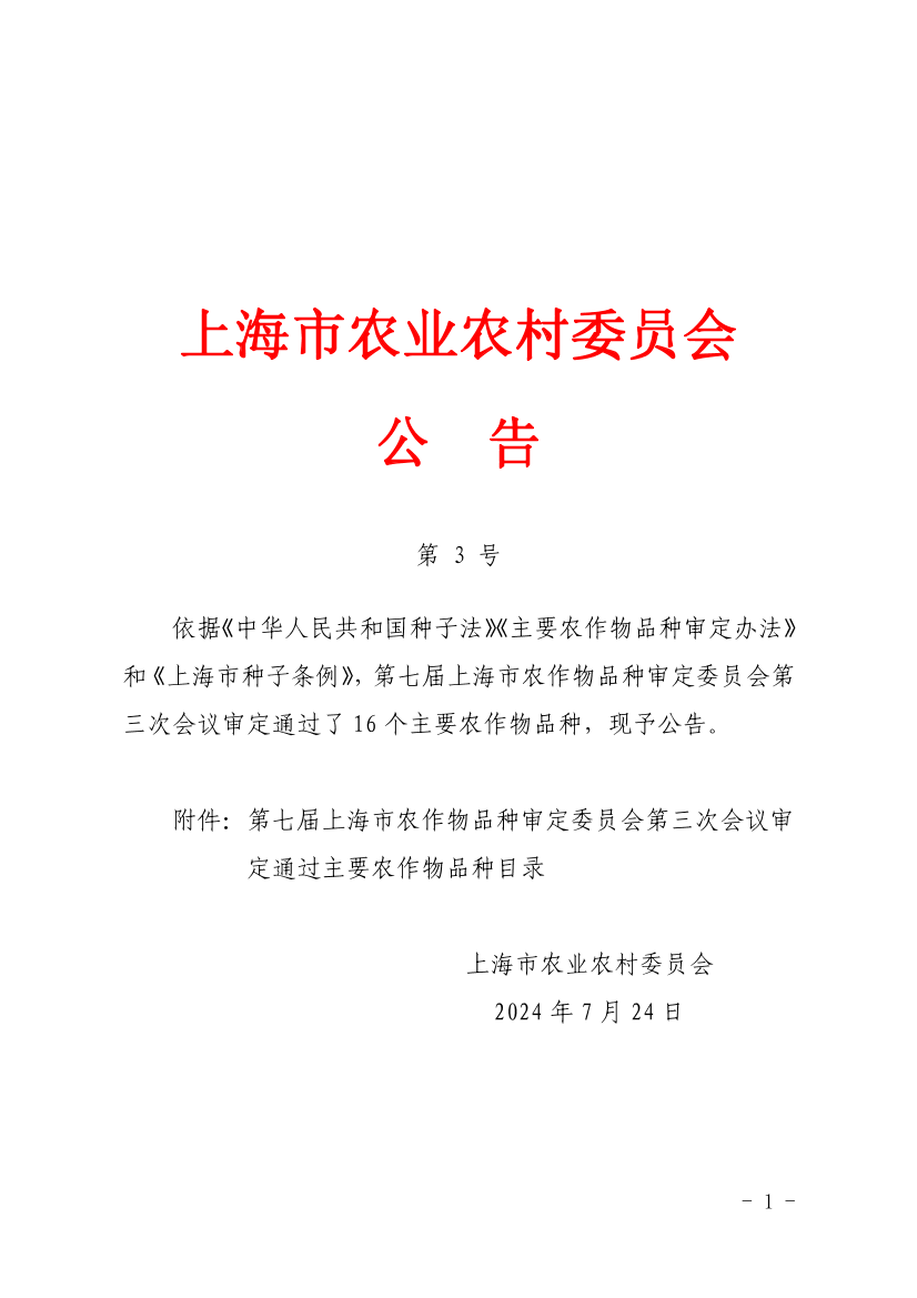 依据《中华人民共和国种子法》《主要农作物品种审定办法》和《上海市种子条例》,第七届上海市农作物品种审定委员会第三次会议审定通过了16个主要农作物品种,现予公告。
