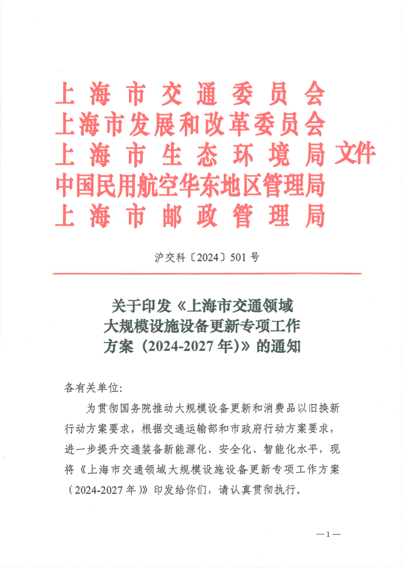 为贯彻国务院推动大规模设备更新和消费品以旧换新行动方案要求,根据交通运输部和市政府行动方案要求,进一步提升交通装备新能源化、安全化、智能化水平,现将《上海市交通领域大规模设施设备更新专项工作方案(2024-2027年)》印发给你们,请认真贯彻执行。